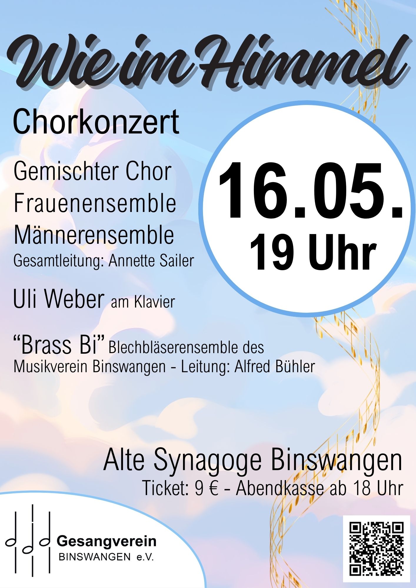 | Samstag; 16.05.2026 19.00 Uhr | Gesangsverein Binswangen e.V.![]() | Frühlingskonzert Ein Abend voller Klang, Emotion und besonderer Atmosphäre erwartet das Publikum beim Frühjahrskonzert des Gesangverein Binswangen. Unter dem Motto „Wie im Himmel“ geben die Akteure ein vielseitiges Programm mit bekannten und berührenden Melodien zum Besten – von eindrucksvollen Chorklängen bis zu gefühlvollen Balladen wie „Gabriellas Song“, „You’ll Never Walk Alone“ oder „The Sound of Silence“. Für zusätzliche musikalische Akzente sorgt das Blechbläserensemble „Brass Bi“ des Musikvereins Binswangen. | Eintritt 9 € | Karten nur an der Abendkasse ab 18 Uhr |