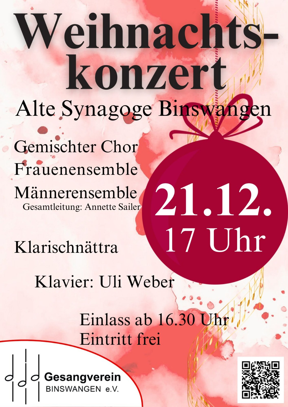 | Sonntag, 21.12.2025 17.00 Uhr | Gesangsverein Binswangen![]() | Der Gesangverein Binswangen lädt zum Weihnachtskonzert in die Alte Synagoge ein. Geboten wird ein abwechslungsreiches Programm mit Chormusik und instrumentalen Beiträgen zur Advents- und Weihnachtszeit, das zur Einstimmung auf das bevorstehende Weihnachtsfest einlädt. Mitwirkende sind der Gemischte Chor, das Männer- und Frauenensemble sowie das Klarinettenensemble „Klarischnättra“. Am Klavier: Uli Weber Leitung: Annette Sailer. ![]() | Eintritt auf Spendenbasis |